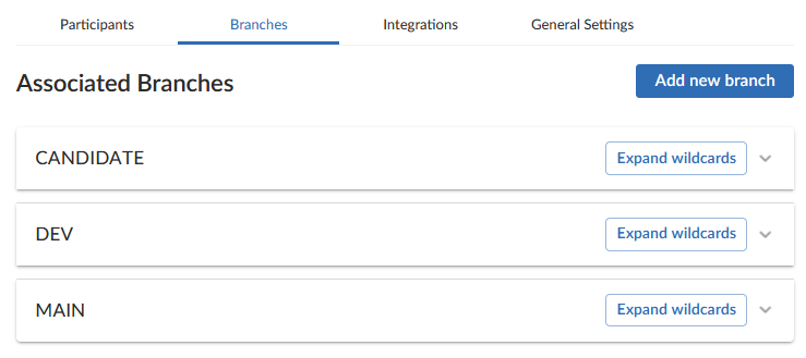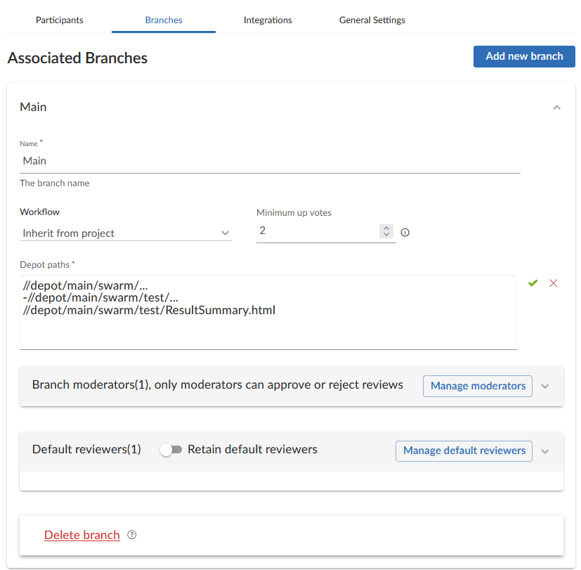 The Branches tab enables you to add a branch and configure the following options: